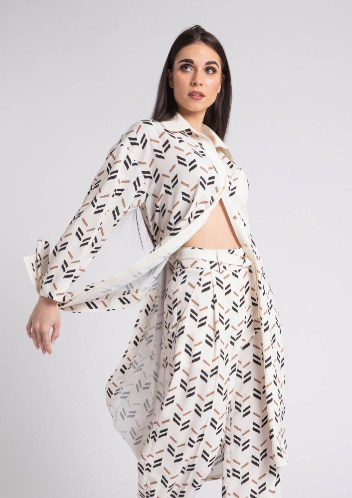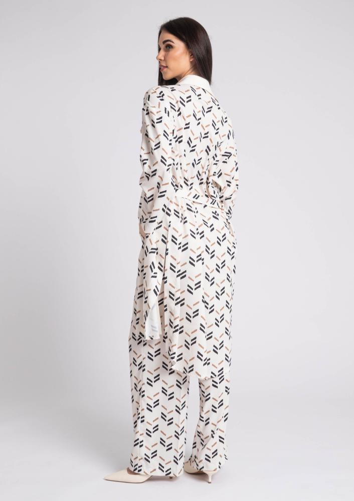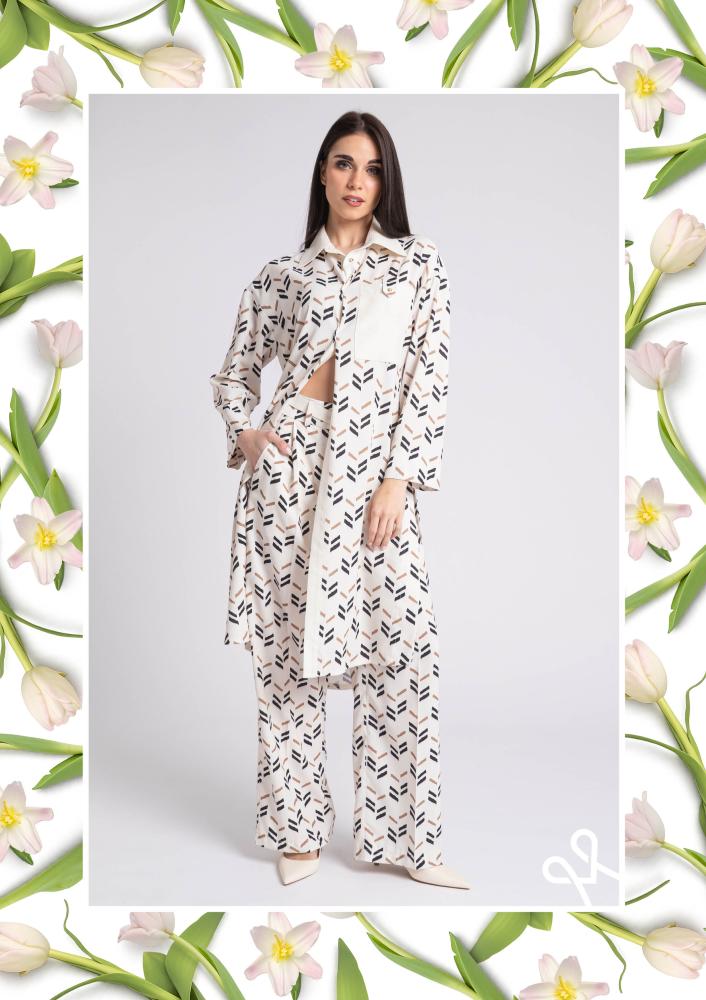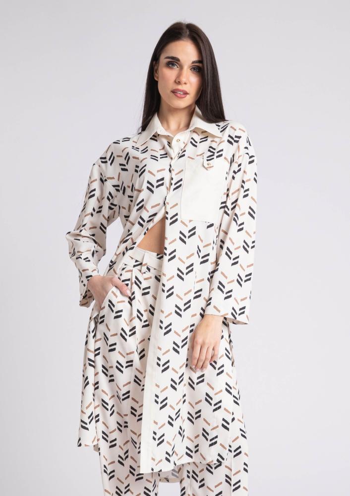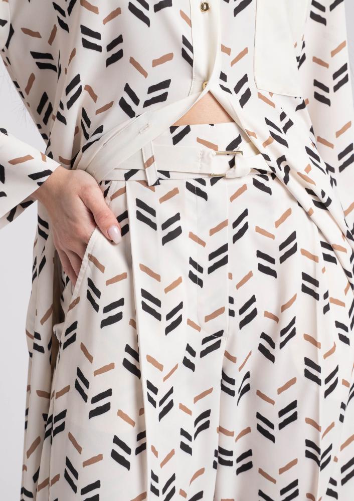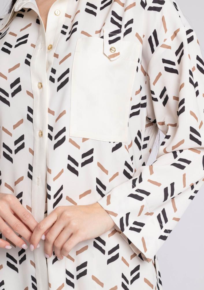 Mintás, kevert szálas Magenta ingruha, laza fazonú, oldalán hasítékkal, elején gombos záródással, foltzsebbel díszített. Oldalán rávarrt textil Magenta márkajelzés.