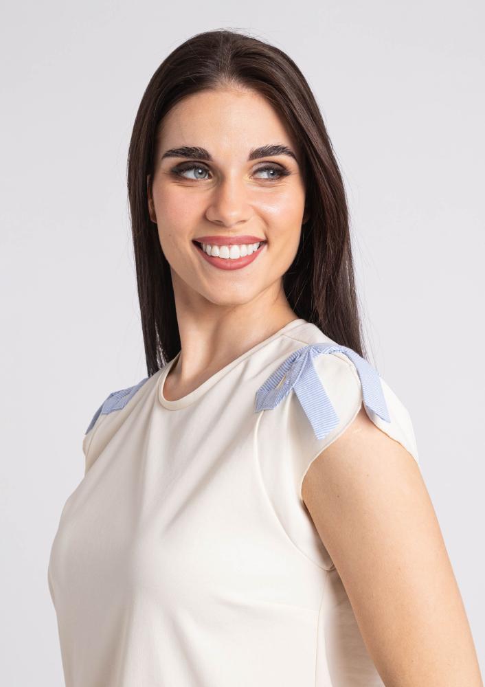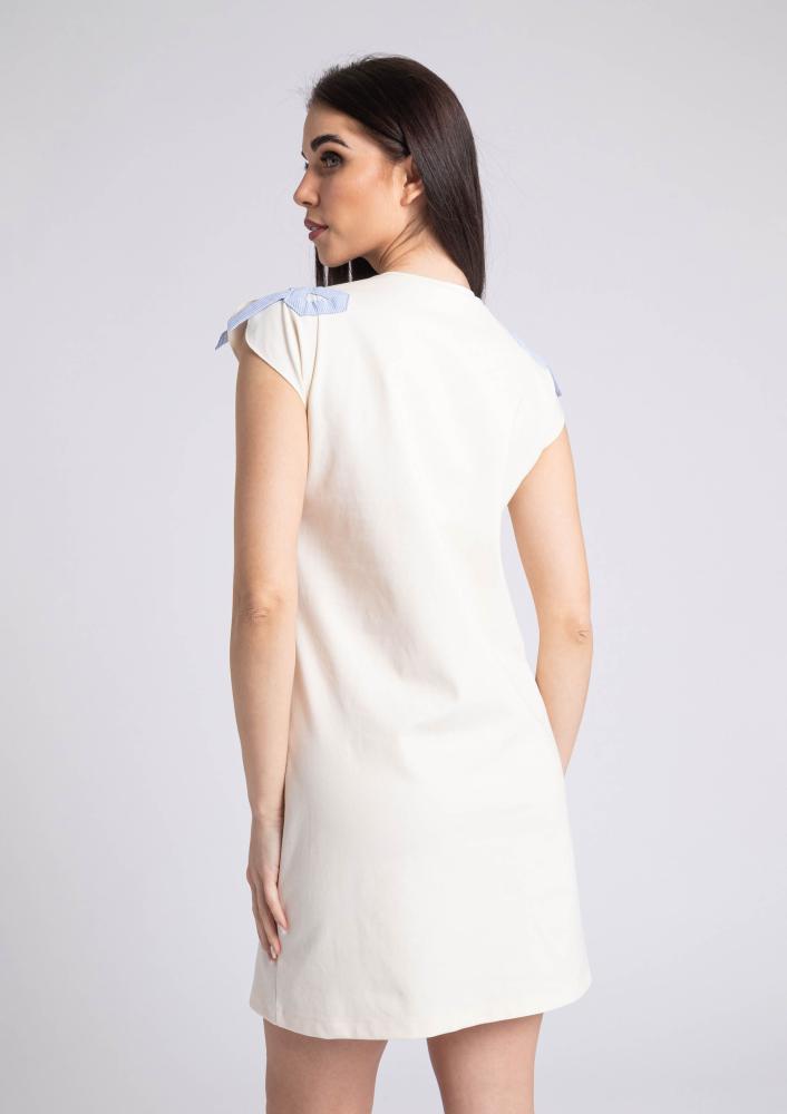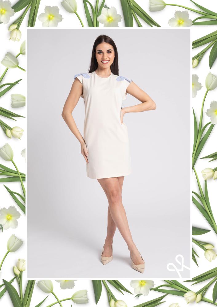 Vaj színű, elasztikus punto Magenta ruha, kerek nyakkivágással, lebegő ujja résszel, vállán masnival díszítve. Oldalán rávarrt textil Magenta márkajelzés.