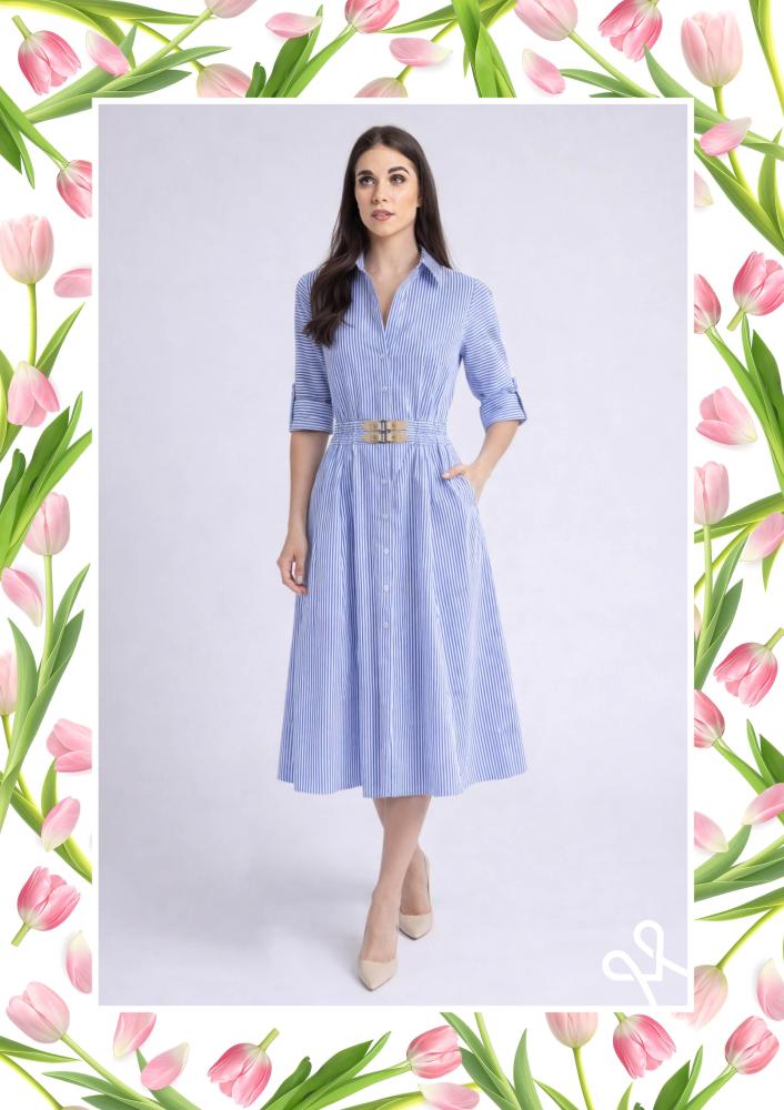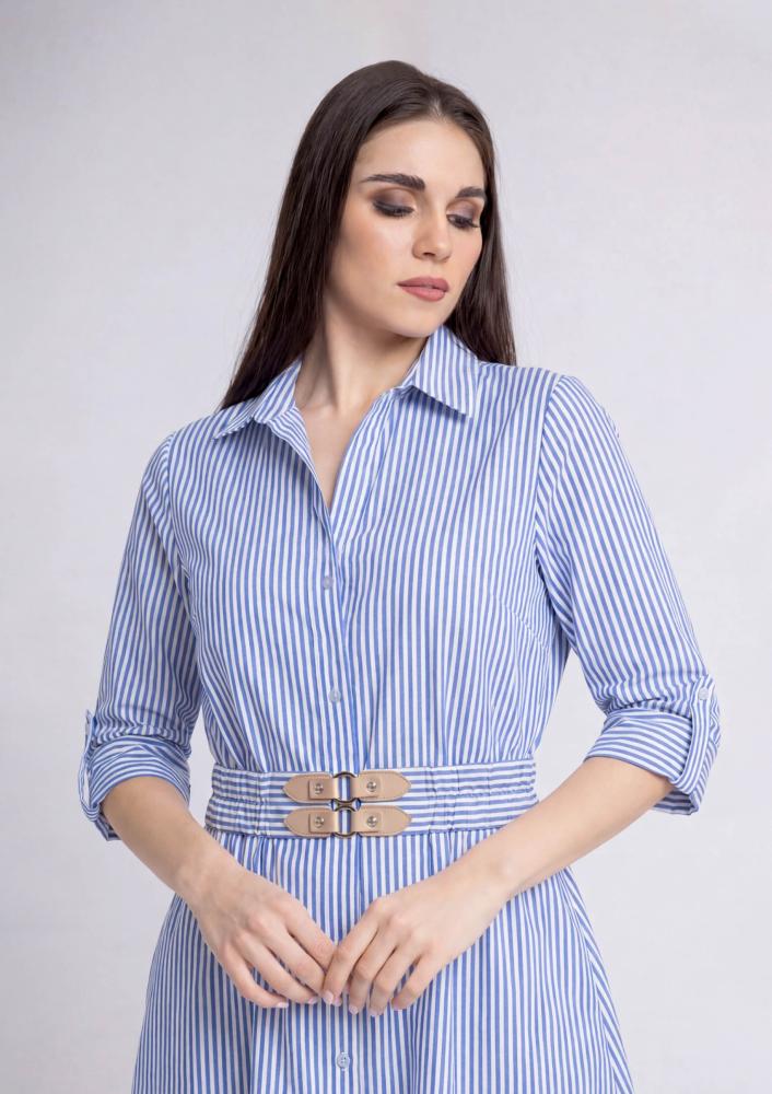 Csíkos, Magenta ingruha, laza fazonú, 3/4 ujjal, elején gombos záródással, gumis derékrésszel és csattos díszítéssel, térd alá érő hosszal. Oldalán rávarrt Magenta márkajelzés.