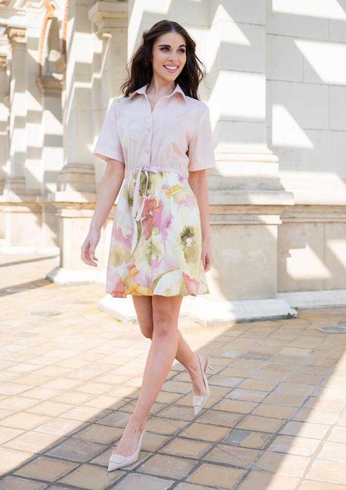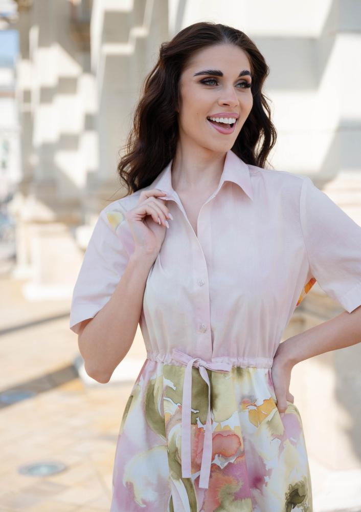 Púder színű, kevert szálas Magenta ingruha, A-vonalú, rövid ujjal, elején gombos záródással, derekán megkötővel, mintás szoknyarésszel. Oldalán rávarrt textil Magenta márkajelzés.