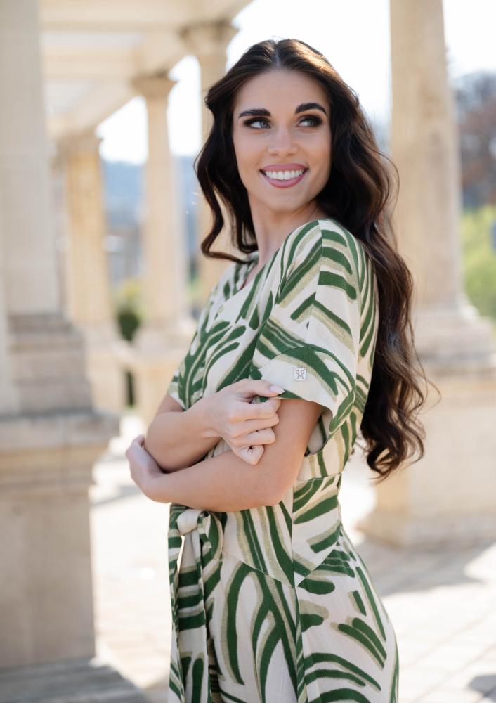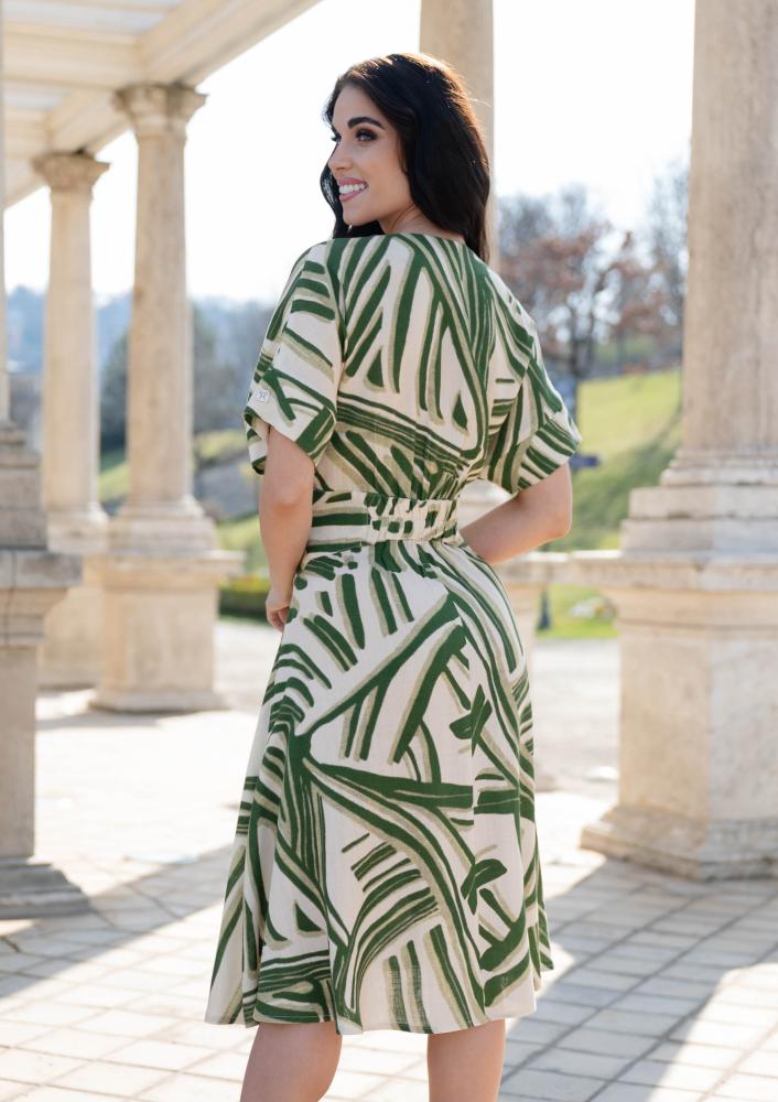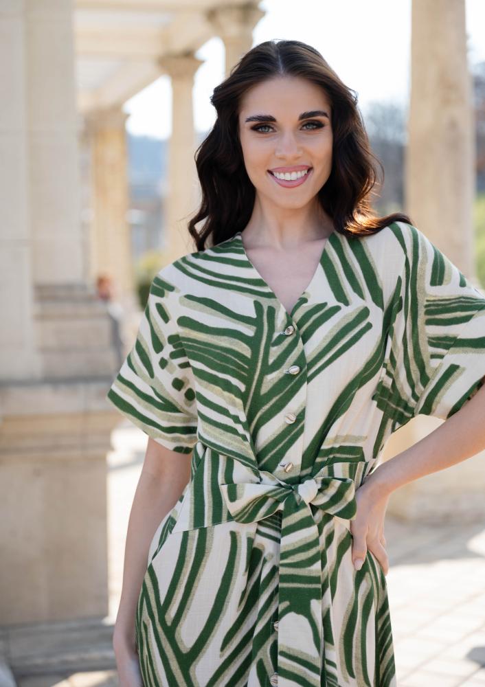 Mintás, vászon Magenta ruha, laza fazonú, V-nyakkivágással, rövid ujjal, elején gombos záródással, saját anyagából megkötővel, térd alá érő hosszal.