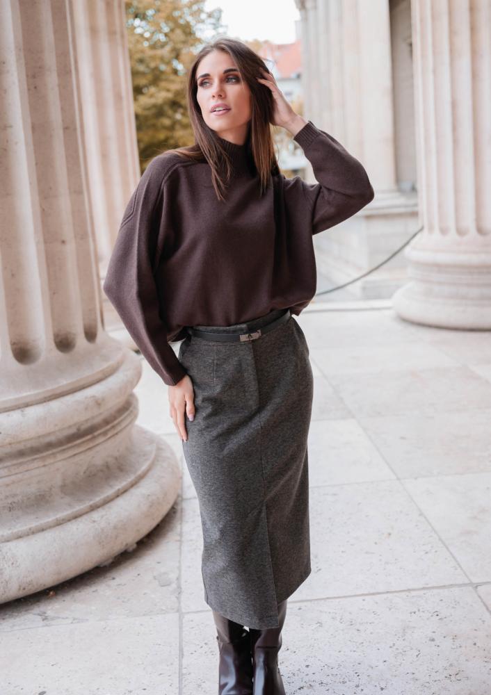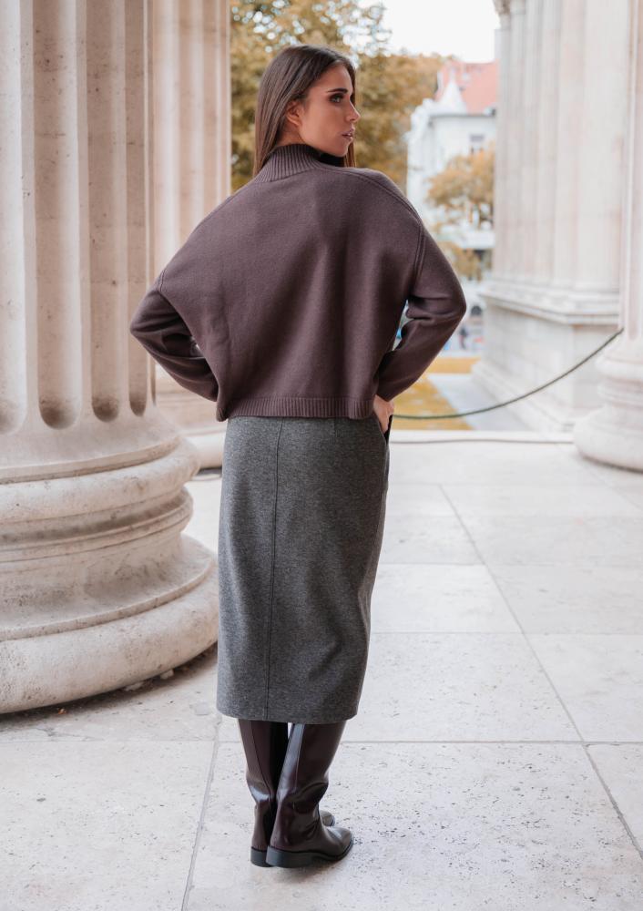 Szürke színű, Magenta ceruzaszoknya, szűk fazonú, oldalán zsebekkl, elején zippzáras és pattentos záródással, elején hasítékkal, hátul gumis derékrésszel. Oldalán rávarrt textil Magenta márkajelzés.