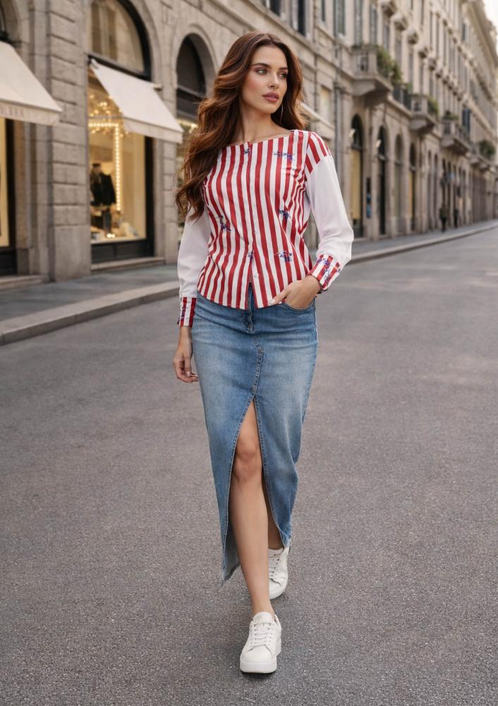 Fekete színű, kevert szálas Magenta szoknya, elején hajtásokkal, derekán láncos megkötővel, övbújtatós derékrésszel, zsebekkel, hátán zippzáras záródással. Oldalán rávarrt fém Magenta márkajelzés.