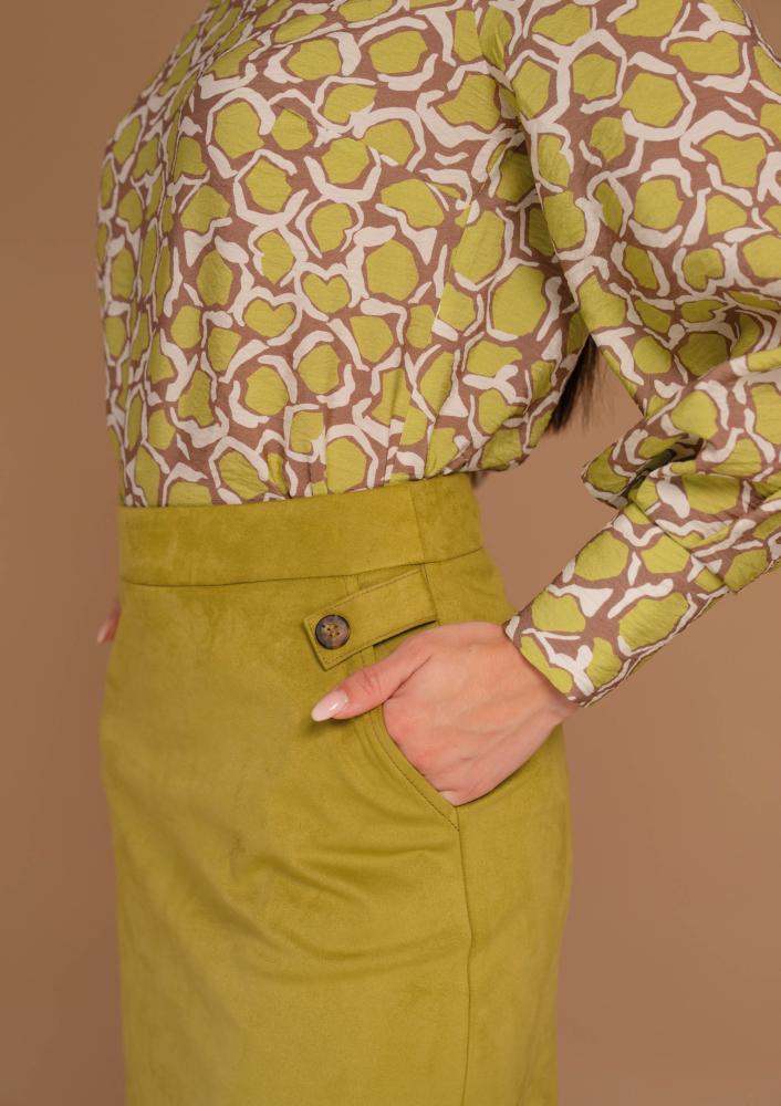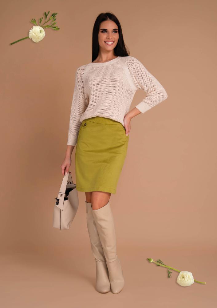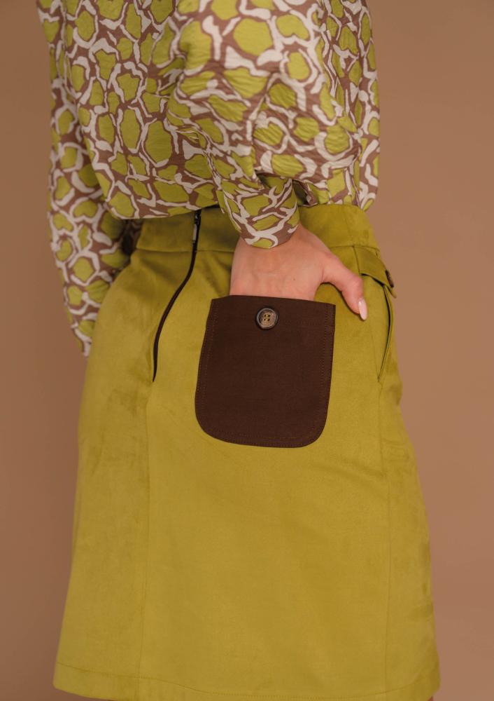 Zöld színű, velúr Magenta szoknya, szűk fazonú, hátán zippzáras záródással, térd fölé érő hosszal. Oldalán rávarrt textil Magenta márkajelzés.