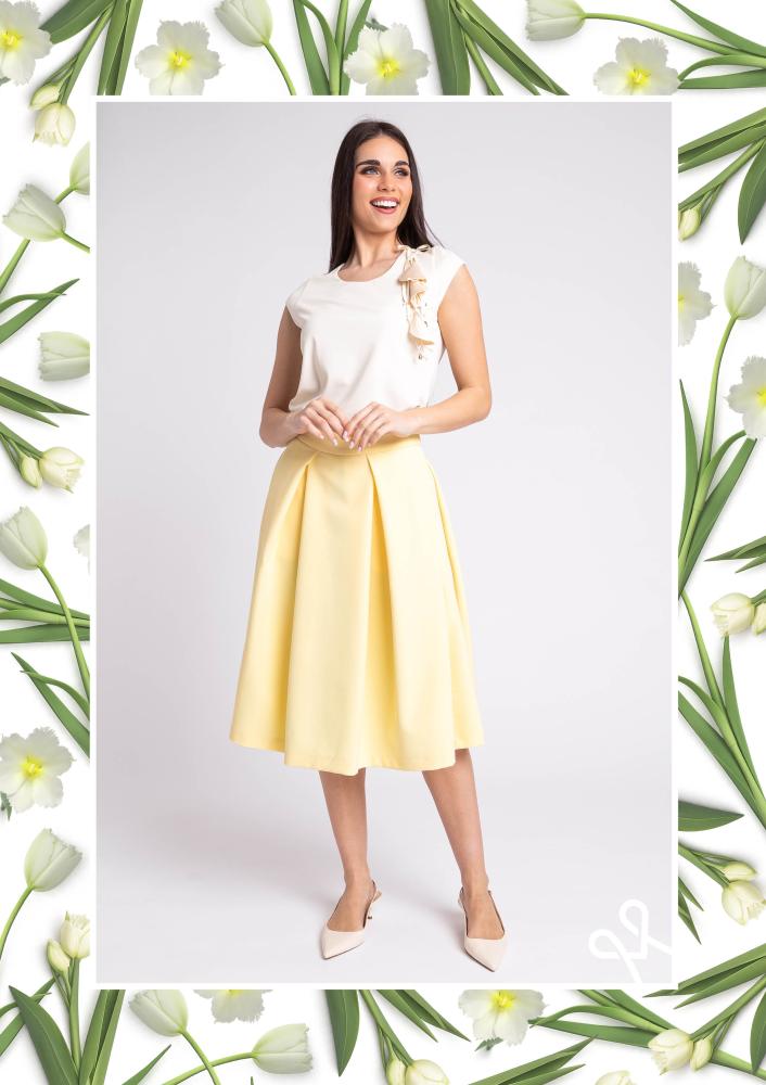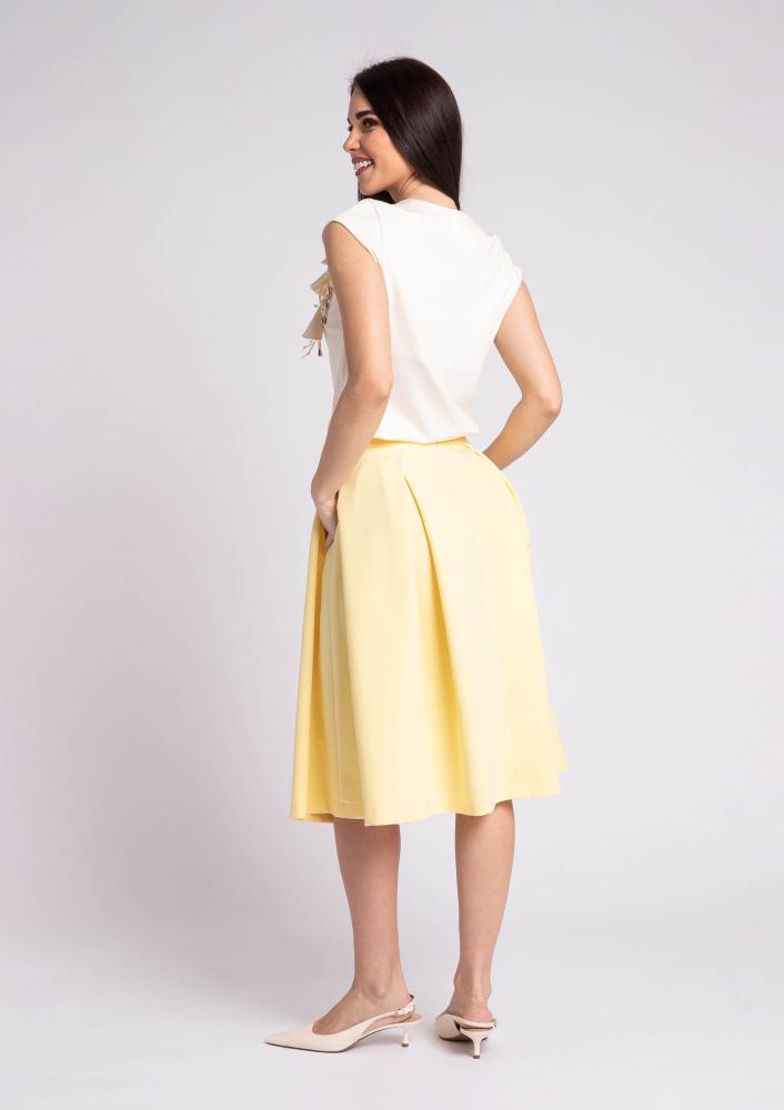 Sárga színű, kevert szálas Magenta szoknya, A-vonalú, derekán hajtásokkal díszített, hátán zippzáras záródással, térdig érő hosszal. Oldalán rávarrt textil Magenta márkajelzés.