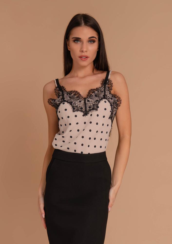 Mintás, kevert szálas Magenta top, csipkével díszített, gumis vékony vállpánttal. Oldalán rávarrt textil Magenta márkajelzés.