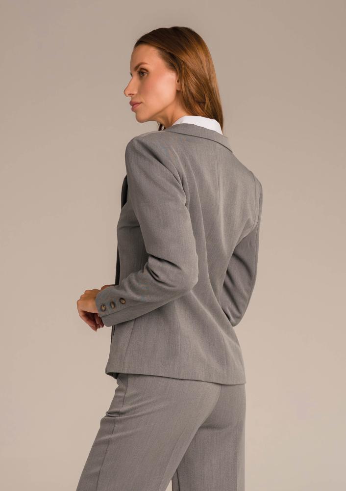 Szürke színű, szövet Magenta zakó, karcsúsított fazonú, aszimmetrikus, átlapolt gombolással, széles lehajtós gallérral. Oldalán rávarrt textil Magenta márkajelzés.