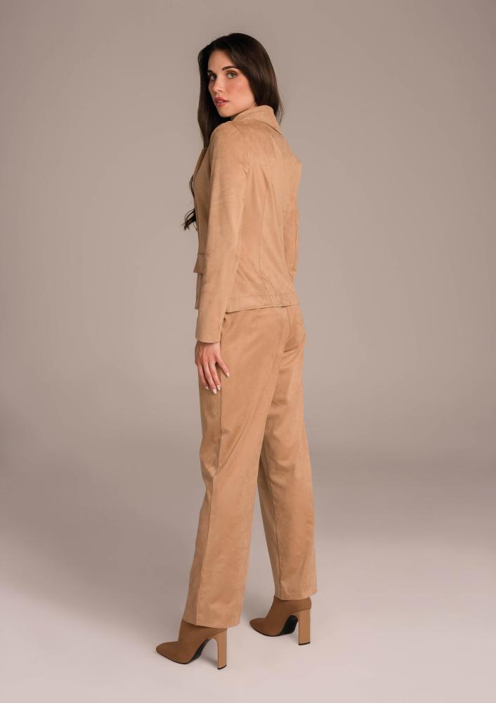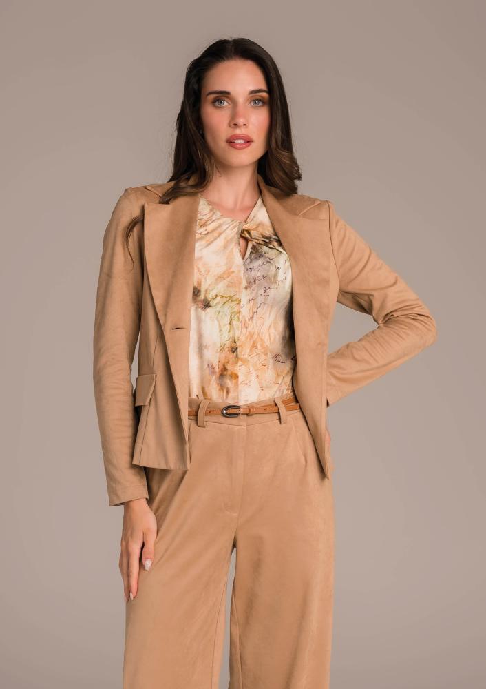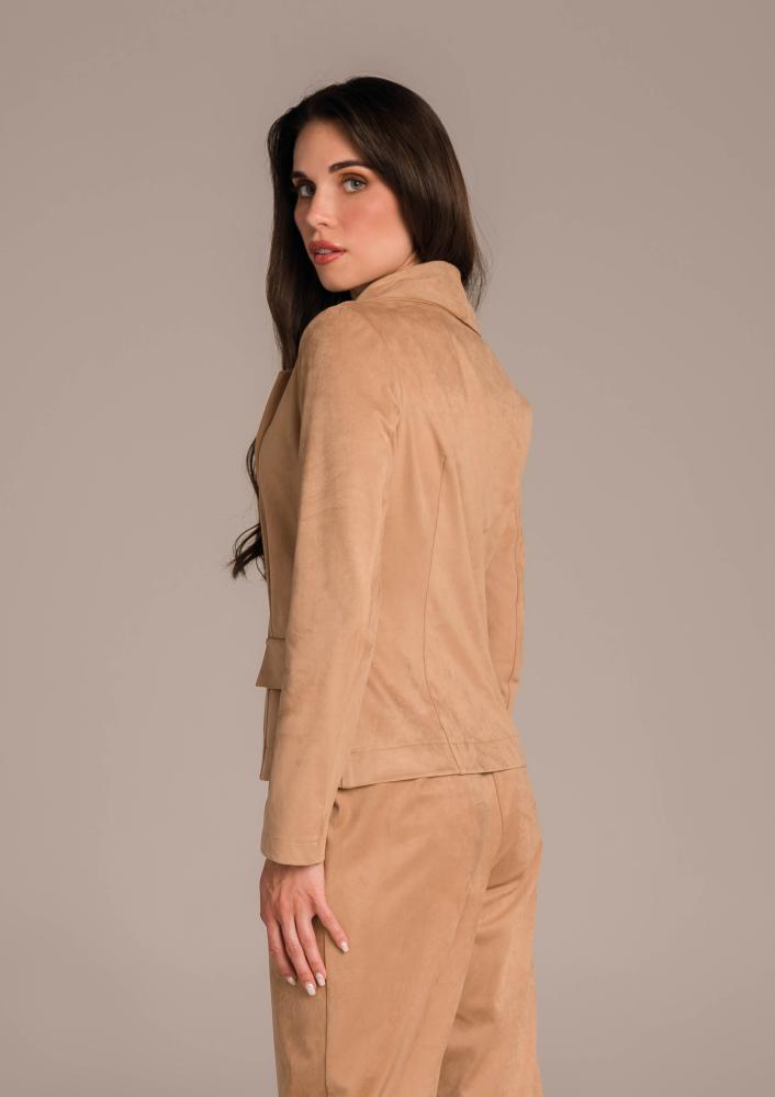 Barna színű, velúr Magenta zakó, karcsúsított fazonú, kihajtós gallérral, elején gombos záródással.