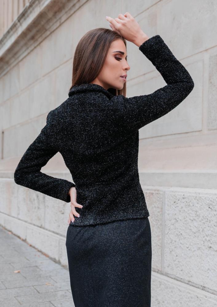 Fekete színű, kevert szálas Magenta zakó, szűkebb fazonú, elején zippzáras záródással. Oldalán rávarrt textil Magenta márkajelzés.