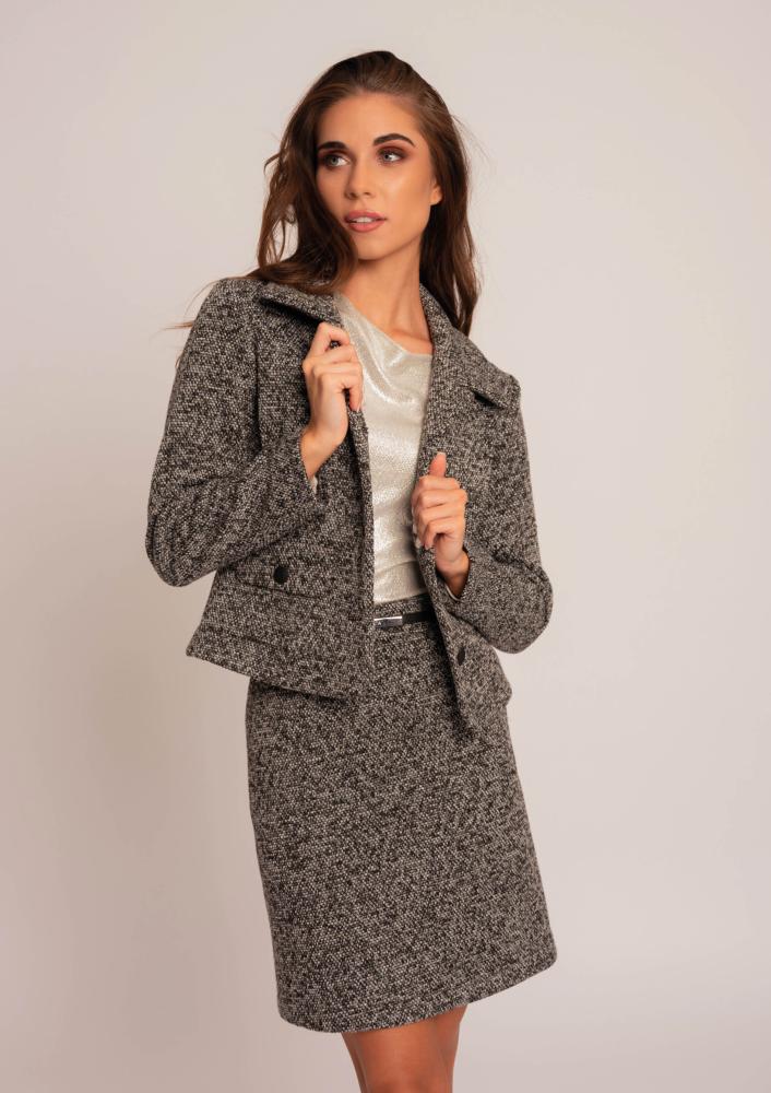 Szürke színű, kevert szálas Magenta zakó, szűkebb fazonú, elején gombos záródással, zsebekkel. Oldalán rávarrt textil Magenta márkajelzés.