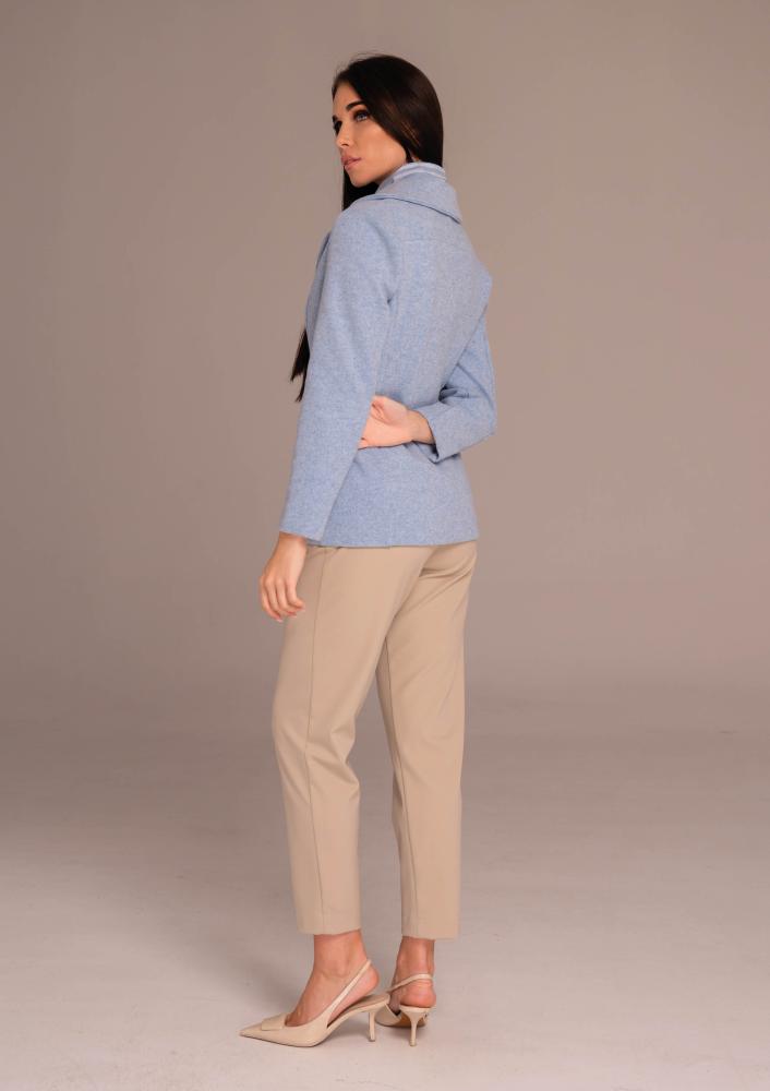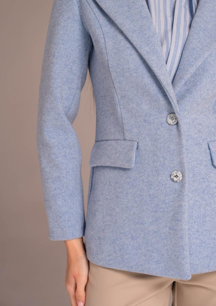 Kék színű, kevert szálas Magenta szövet zakó, karcsúsított fazonú, elején gombos záródással, oldalán zsebekkel. Hátán rávarrt textil Magenta márkajelzés.
