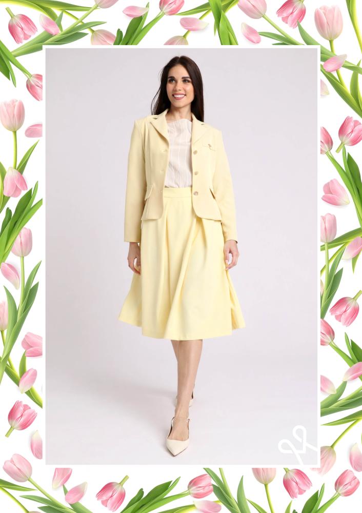 Bézs színű, sportos, elasztikus Magenta zakó, alakot követő, zsebekkel, elején gombos záródással, ujja alján passzéval.